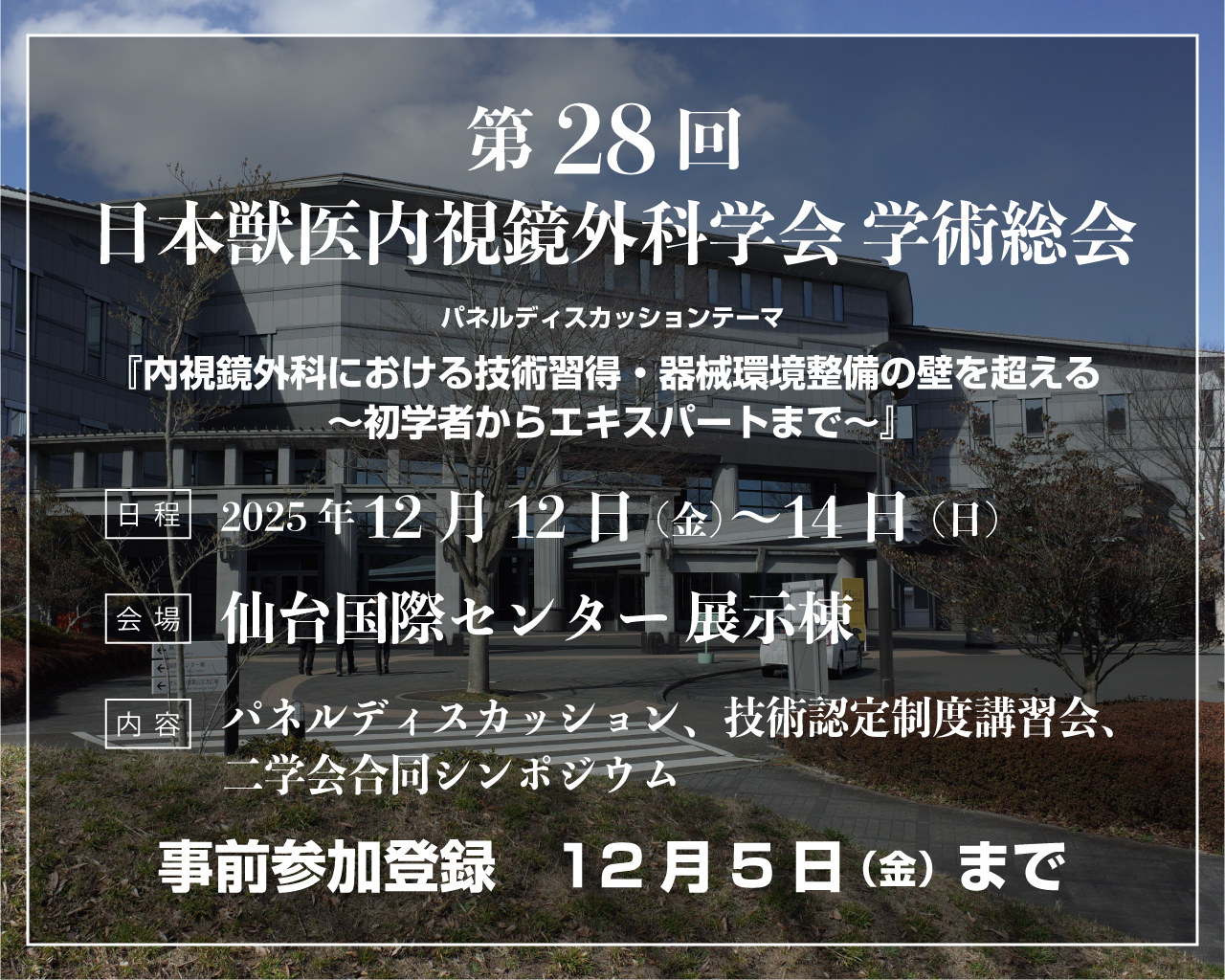 第28回日本獣医内視鏡外科学会学術総会は、2025年12月12日(金)・13日(土)・14日(日) 仙台国際センターにて開催します。